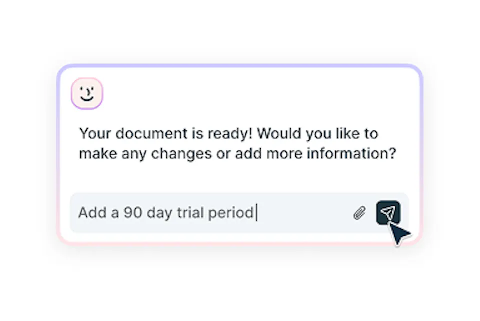 The assistant also offers smart suggestions on ways to improve your NDA based on your current content and the training it has received on many similar documents. Once you're happy with it, you can download it in your preferred format or send it directly to be eSigned.