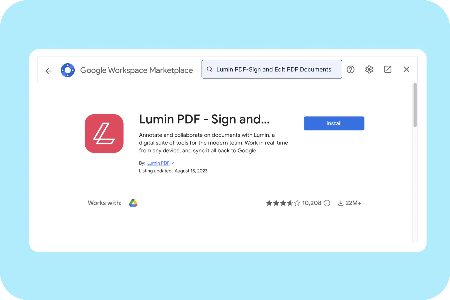 In the search bar, type in ‘Lumin’. Click, install and enjoy using Lumin from Google Workspace!
