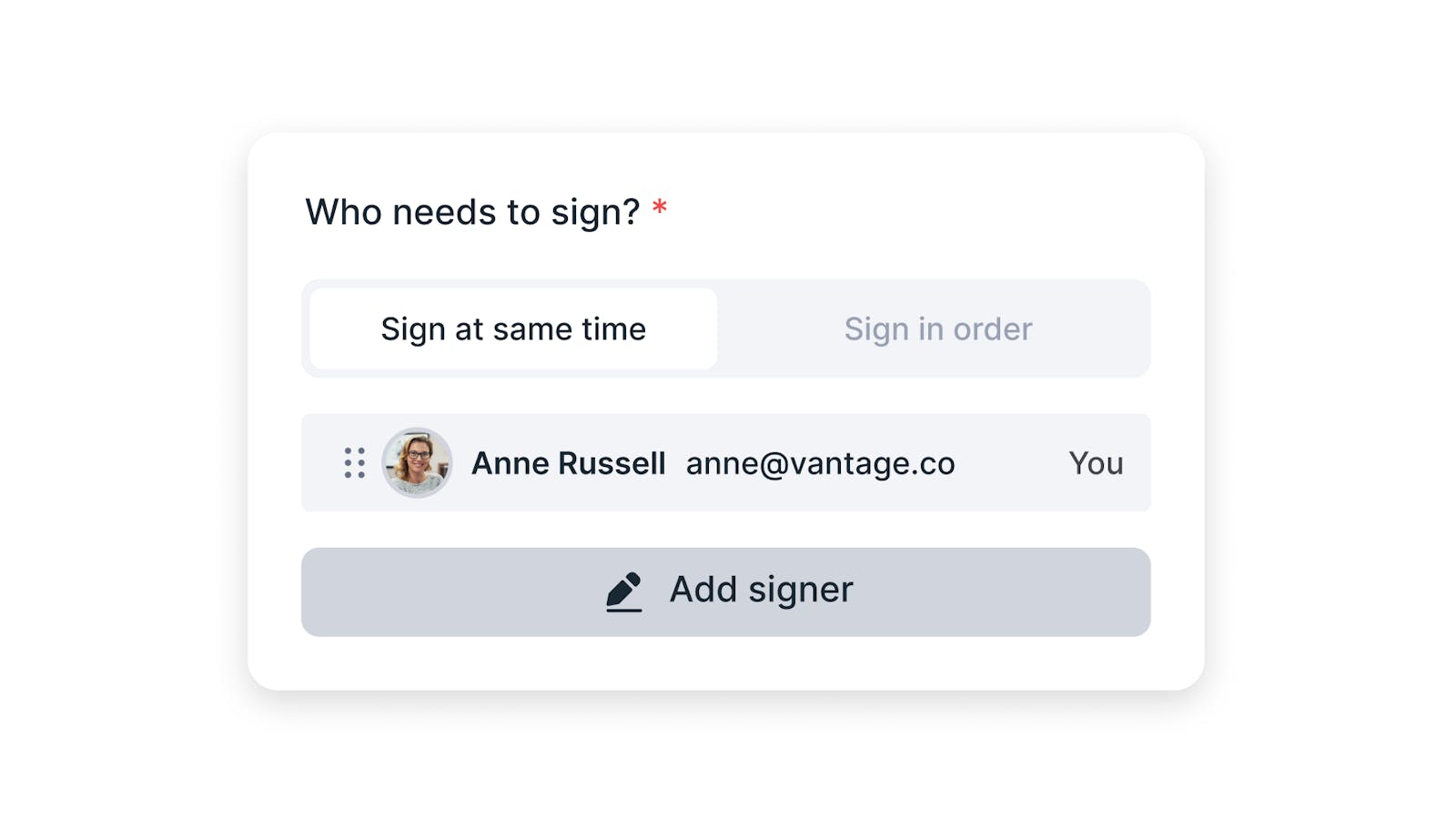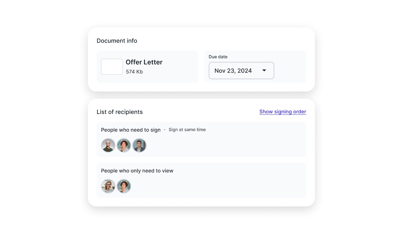 Envie documentos para várias pessoas de uma vez e colete todas as assinaturas necessárias de forma segura em um único lugar. Precisa de duas ou vinte assinaturas? Gerencie todos os signatários em um só painel com total visibilidade.
